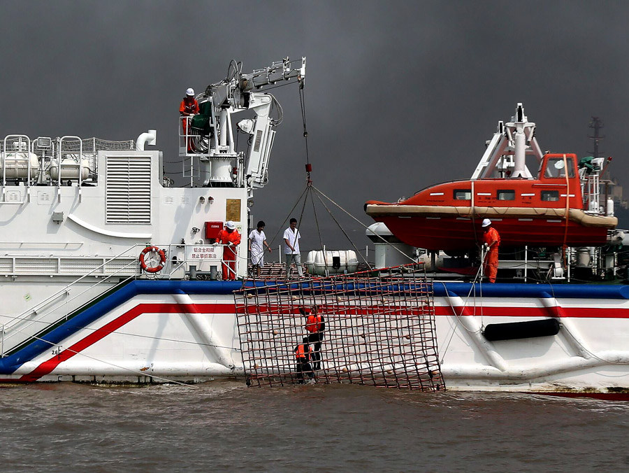 Drowning sailors are saved by a rescue ship during the oil slick emergency response drill. [Photo by Shen Lei/For China Daily]