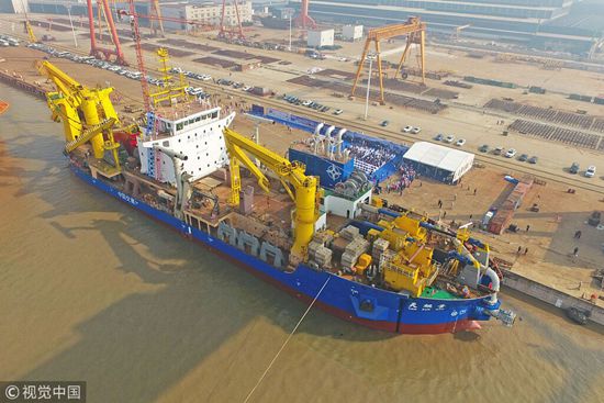 2017年11月3日上午,我国自主设计并建造的亚洲最大、最先进的绞吸挖泥船“天鲲号”在江苏启东成功下水,标志着中国疏浚装备研发建造能力进一步升级,已处于世界先进水平。[视觉中国] |