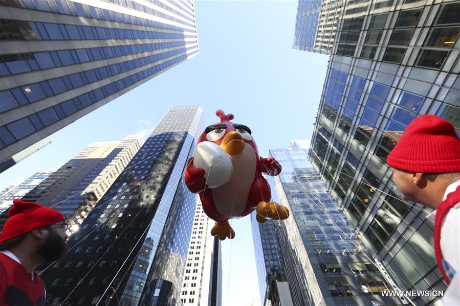 11月23日,在美国纽约感恩节大游行上,“愤怒的小鸟”造型气球行进在曼哈顿街头。当日,美国纽约举行梅西感恩节大游行,各式各样的玩偶气球、花车队伍在曼哈顿的摩天大楼间穿行,形成一道独特的风景。[新华社 王迎 摄]