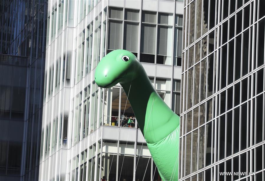 11月23日,在美国纽约感恩节大游行上,“辛克莱的恐龙”造型气球现身曼哈顿街头。当日,美国纽约举行梅西感恩节大游行,各式各样的玩偶气球、花车队伍在曼哈顿的摩天大楼间穿行,形成一道独特的风景。[新华社 王迎 摄]
