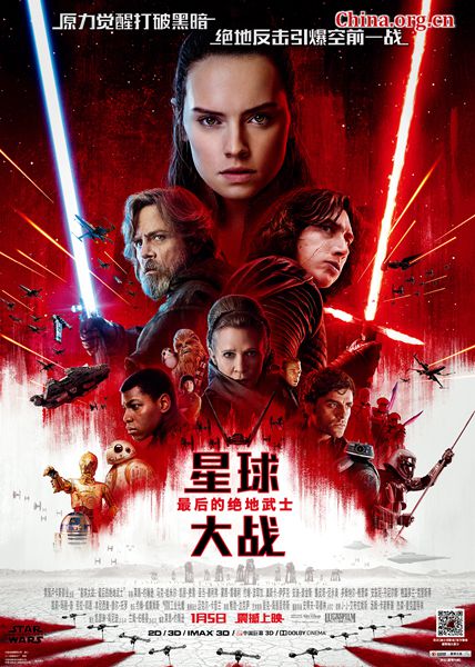 中国网12月4日讯 由迪士尼影业发行、卢卡斯影业制作的年度巨制《星球大战:最后的绝地武士》今天发布全新中国版预告片和中文海报,光明与邪恶之间的大战一触即发,震撼人心的太空歌剧又将迎来新的篇章。这部备受影迷期待的影片已经正式定档2018年1月5日以开年巨制的姿态登陆中国内地。此外,黛茜·雷德利、马克·哈米尔两位新老主演将携手导演莱恩·约翰逊、制片人兰姆·伯格曼一同来华宣传,于12月20日在上海迪士尼度假区的迪士尼小镇举行盛况空前的红毯和电影首映礼。