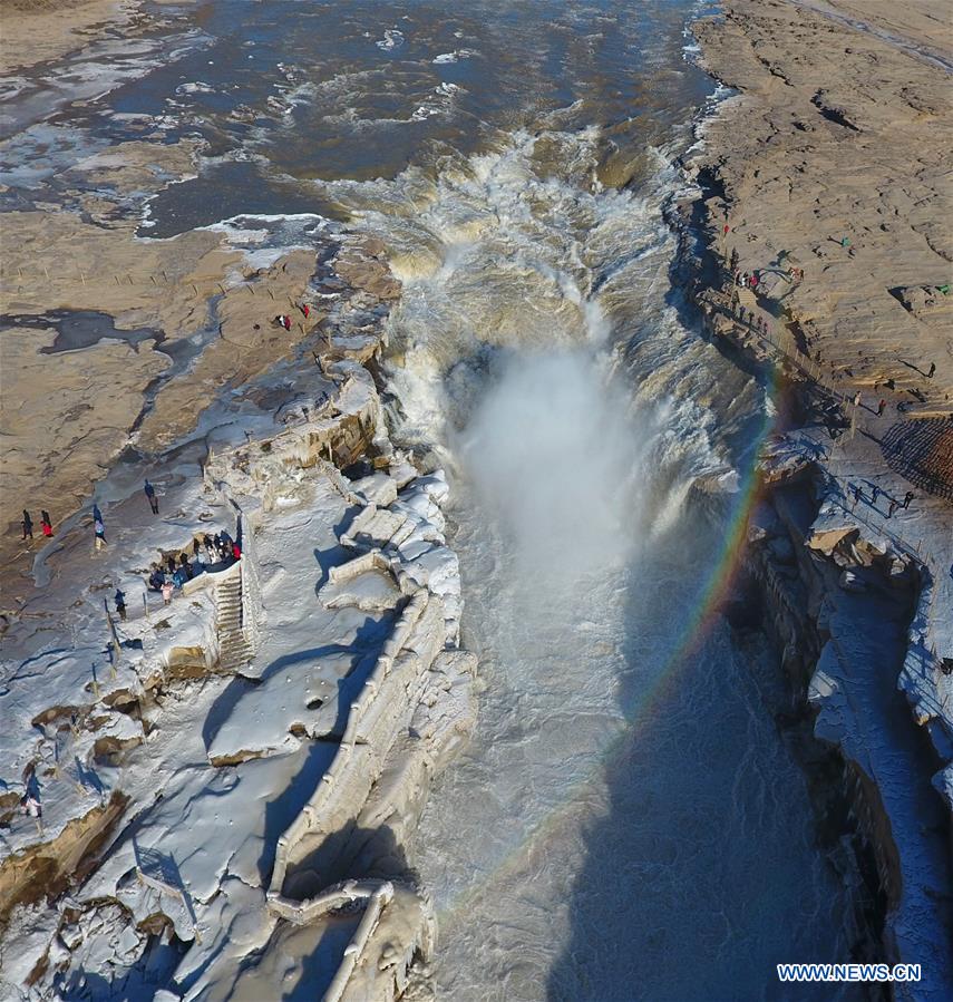 Photo taken on Dec. 17, 2017 shows a rainbow arching over the Hukou Waterfall on the Yellow River in Jixian County, northwest China's Shanxi Province. (Xinhua/Lyu Guiming)