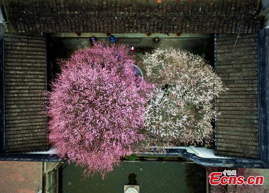 1月25日,位于福州北峰山区的千年古刹林阳寺梅花盛开,吸引许多游客前来赏花游玩。林阳寺是福州五大禅寺之一,相传建于唐朝,距今已有千年历史。图为空中鸟瞰已有200多年历史的红白两株梅花。[中新社 王东明 摄]