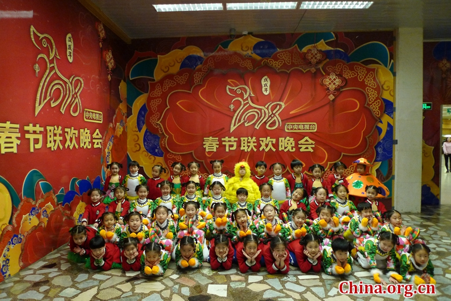 空军蓝天幼儿艺术团的小演员们在央视春晚演播大厅合影留念。[空军蓝天幼儿艺术团 供图]