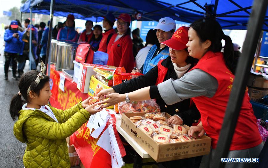 Volunteers distribute food to stranded tourists in Haikou, capital of south China's Hainan Province, Feb. 23, 2018. More than 12,000 vehicles returning home from a week-long break remained stuck in a seemingly endless traffic jam for ferries in Hainan Province as of Friday afternoon. (Xinhua/Guo Cheng)