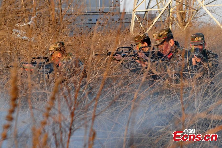 Armed police in Xinzhou City, Shanxi Province conduct comprehensive field training to improve their response to contingencies. The training program includes searching, reconnaissance and use of special equipment. (Photo: China News Service/Yuan Haoxiang)
