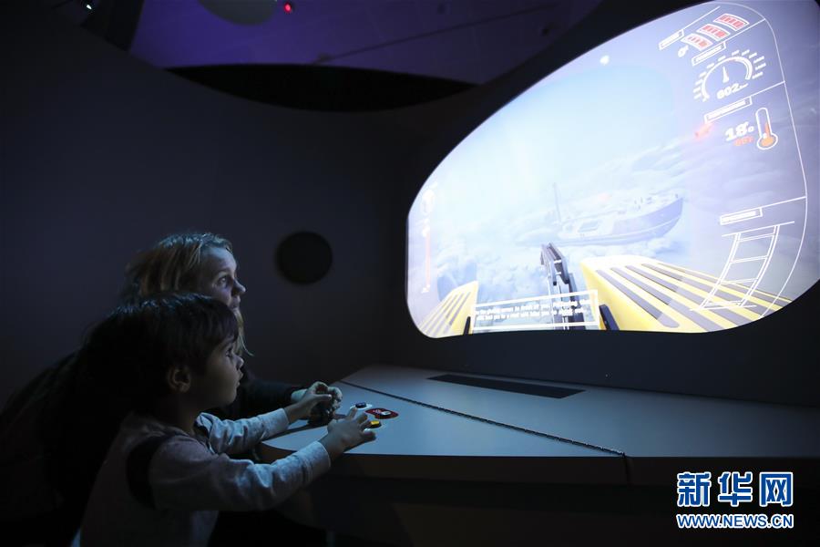 3月14日,在美国纽约自然历史博物馆举行的“未见的海洋”展览上,一对母子操作模拟潜水器探索海底世界。此次展览于3月12日对公众开放,计划持续至2019年1月6日。展览以多种形式展示海洋研究领域的最新手段和成果,为参观者呈现“前所未见”的神秘海洋世界。(新华社记者 王迎 摄)