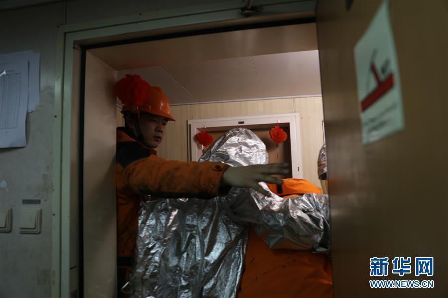 Photo taken on March 22, 2018 shows crew members and researchers taking part in a drill simulating a fire on Chinese icebreaker "Xuelong", meaning Snow Dragon, in the Amundsen Sea. The icebreaker is on its 34th Antarctic expedition. (Photo/Xinhua)