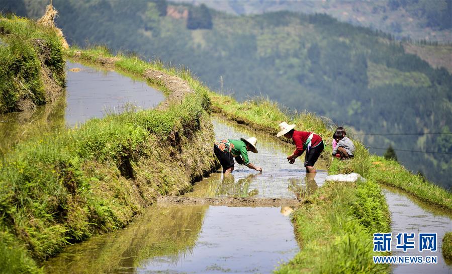 Villagers work in the terraced fields at Cenfeng Village in Congjiang County, southwest China's Guizhou Province, April 17, 2018. (Xinhua/Wu Dejun)