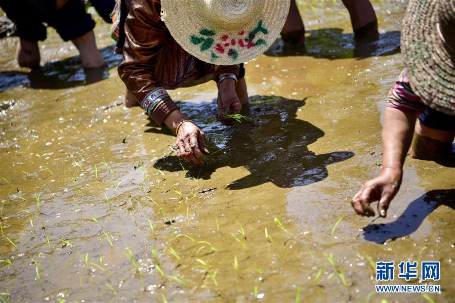 4月17日,在贵州省从江县翠里瑶族壮族乡岑丰村,农民在梯田里寄秧。[新华社 吴德军 摄]