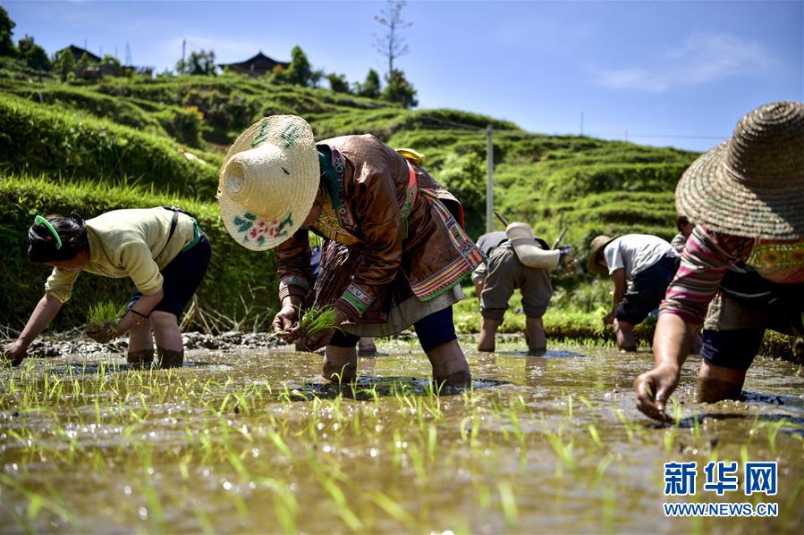 4月17日,在贵州省从江县翠里瑶族壮族乡岑丰村,村民在梯田里寄秧。[新华社 吴德军 摄]