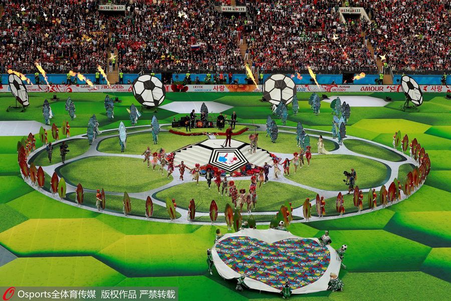 A general view as Robbie Williams and Aida Garifullina perform at the opening ceremony of the FIFA World Cup 2018. [Photo/Osports]