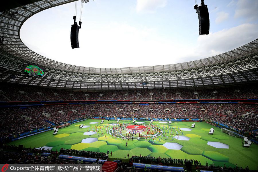 A general view as Robbie Williams and Aida Garifullina perform at the opening ceremony of the FIFA World Cup 2018. [Photo/Osports]