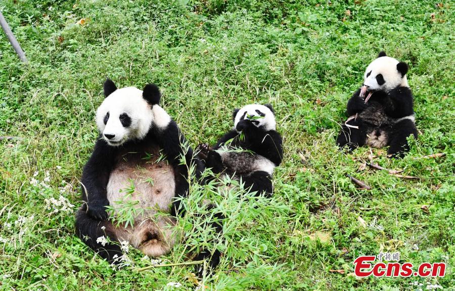 Giant panda Haizi and its twin cubs play at the Dujiangyan Base of China Conservation and Research Center for Giant Pandas in Southwest China's Sichuan Province, June 19, 2018. (Photo: China News Service/An Yuan)