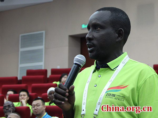 南苏丹青年代表Garang Majak Bol Angok就如何破解交流中的语言壁垒问题提问。[中国网 李慧如 摄]