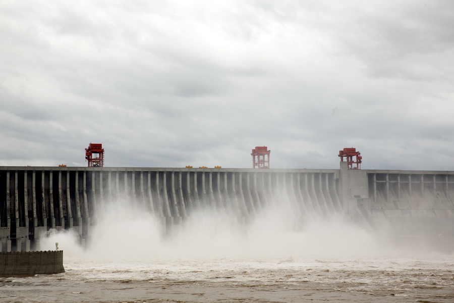 Photo taken on July 5, 2018 shows water discharging from the Three Gorges Dam, a gigantic hydropower project on the Yangtze River, in central China's Hubei Province. At 8 a.m. of July 5, the reservoir faced an inflow of 51,000 cubic meters per second and an outflow of 40,000 cubic meters per second. The first flood of the Yangtze River this year has formed on its upper reaches. (Xinhua)