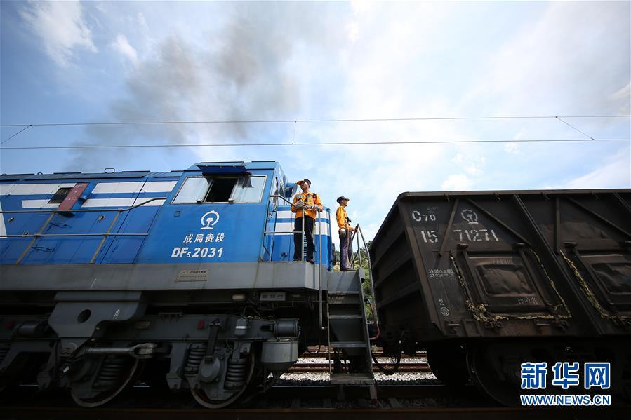 7月17日,在贵州省凯里车务段玉屏火车站,制动员刘祖晗(右)与调车长在调动车辆。 (新华社发 黄晓海 摄)