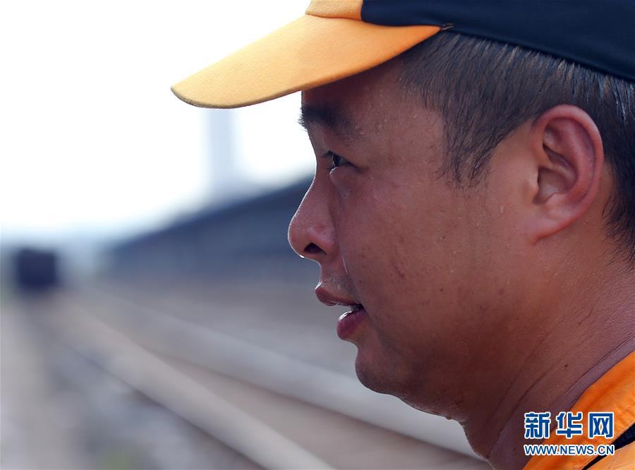 7月17日,在贵州省凯里车务段玉屏火车站,连结员刘健在烈日的灸烤下坚守岗位。 (新华社 张晖 摄)