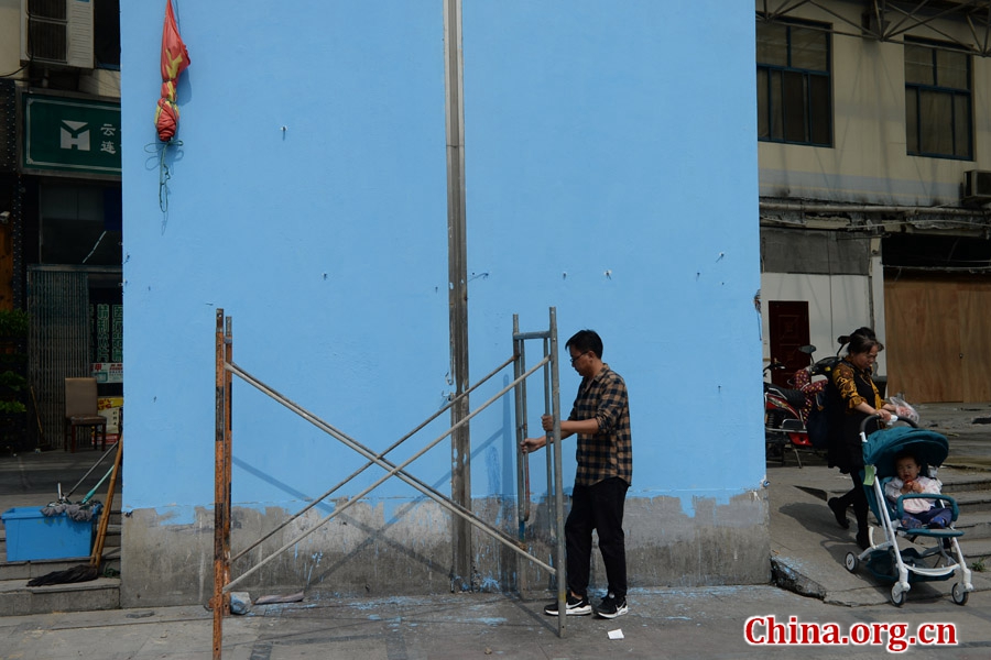 Yue Yawei sets up a scaffold at a mural project site. He is the director of the company as well as being a mural painter himself. [Photo by Chao Fan/China.org.cn]