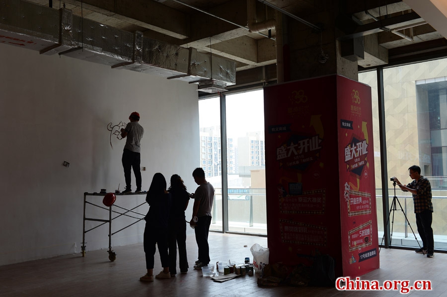 The muralists concentrate on their work at a project site. [Photo by Chao Fan/China.org.cn]