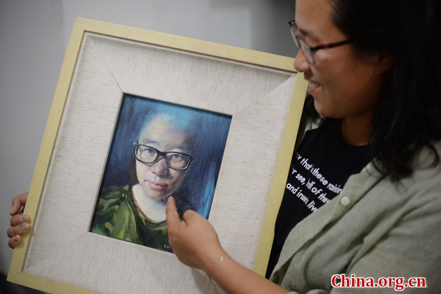 Guo Jinling, the art director of Yue Yawei's company, displays her portrait, painted by a colleague. [Photo by Chao Fan/China.org.cn]