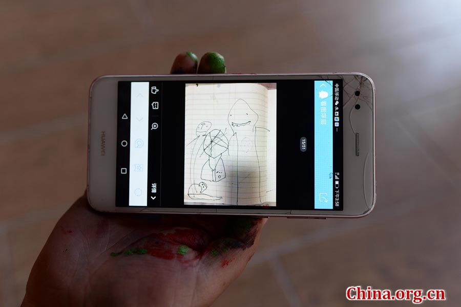 Art director Guo Jinling shares a photo on her phone of her child's drawing. While Guo works in Shanghai, her child stays in Kunshan, Jiangsu province. [Photo by Chao Fan/China.org.cn]