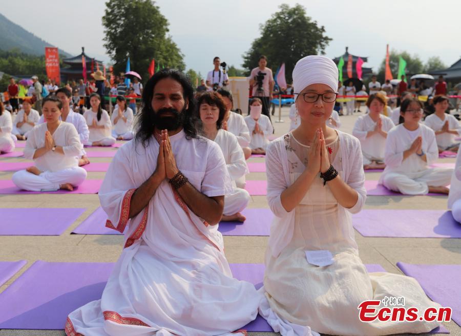Yoga and kung fu enthusiasts perform in a cultural festival on Mount Song, home to the Shaolin Temple, in Dengfeng, Central China's Henan Province, Aug. 25, 2018. (Photo: China News Service/Wang Zhongju)