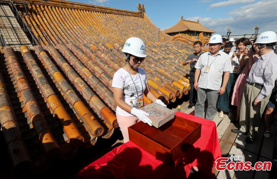 9月3日,故宫古建部副研究馆员徐超英展示养心殿正脊内的宝匣。当日,故宫养心殿研究性保护项目古建筑维修保护正式开工。在经过两年多的文物记录和撤陈、文物残损病害的修复、古建筑勘察测绘、匠人培训选拔等工作后,故宫养心殿古建筑研究性保护修缮工作正式进入实施阶段。本次修缮范围占地面积约7707平方米,建筑面积约2540平方米,修缮内容包括遵义门内的养心殿、工字廊、后殿、梅坞等13座文物建筑及其附属的琉璃门、木照壁等。[中新社 张宇 摄]