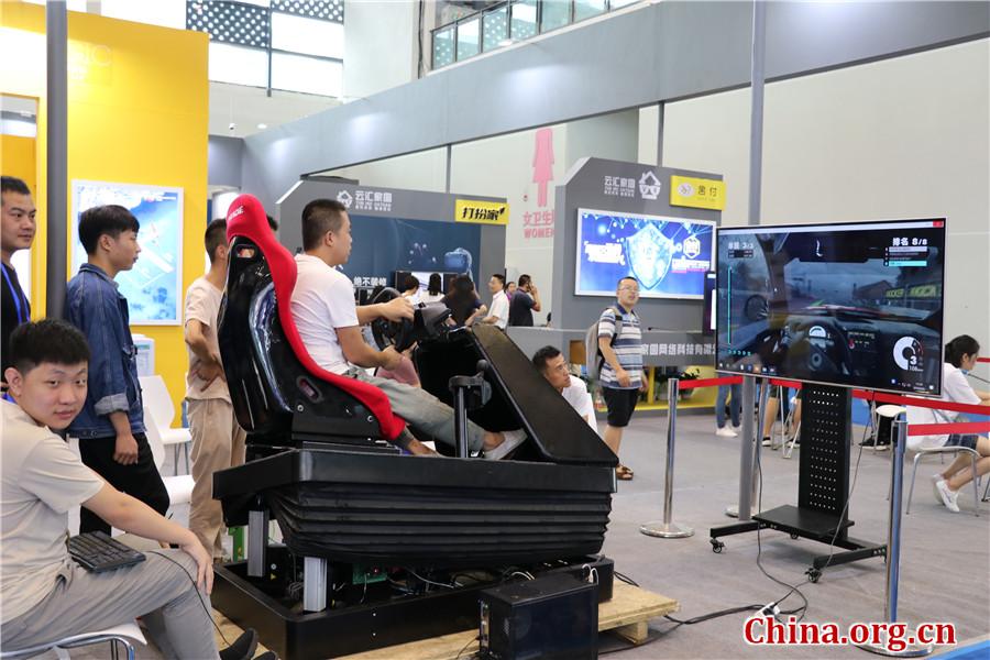 9月6日,一位参展者在绵阳科博会VR/AR展区内体验赛车游戏。(中国网 郑成琼摄)