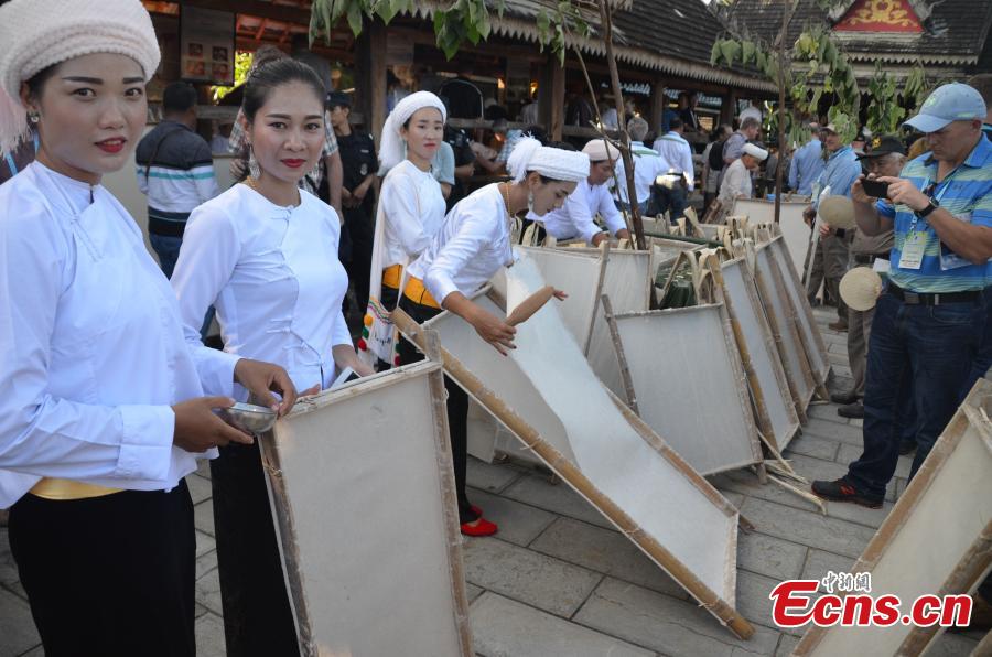 Women of Dai ethnic group show traditional paper-making craft, using a kind of bark as raw material, at Mengtuan Village in Lincang City, Southwest China's Yunnan Province, Oct. 15, 2018. The paper-making technique dated from 600 years ago and was listed as a national intangible cultural heritage in 2006. (Photo: China News Service/Miao Chao)