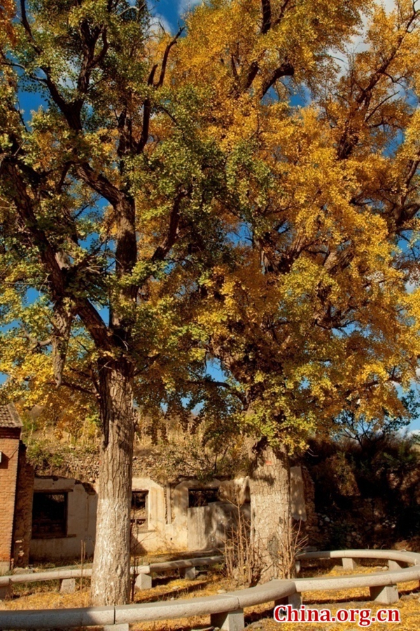 2011年时,当地村民告诉我们,这里的两棵银杏树,都是雄树。但西边(左)的这棵银杏树为雌雄同株,靠西侧有一杈,是老年间的人将雌枝嫁接在雄树上形成。