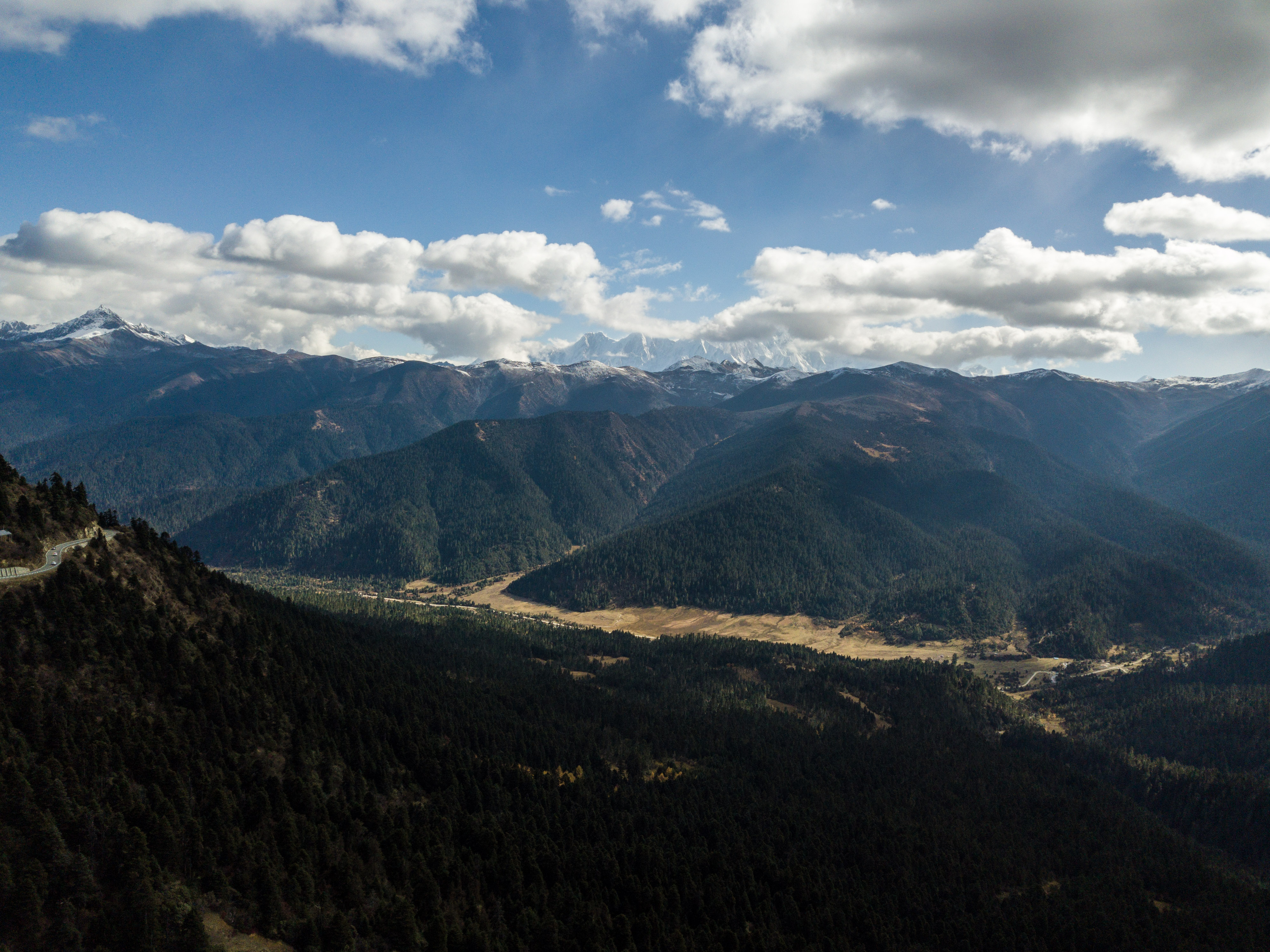 鲁朗林海和远处的南迦巴瓦峰交相辉映。【中国网孙韬 摄】