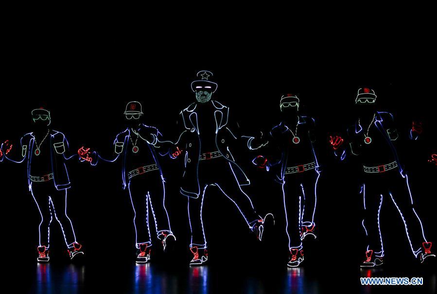 11月27日,在美国纽约,电光舞团体Light Balance在《魔术师——假日魔法》媒体秀上表演。11月23日至12月30日,巡回魔术秀《魔术师——假日魔法》登陆纽约百老汇,为观众带来精彩纷呈的魔术表演和缤纷炫目的电光舞秀。[新华社 王迎 摄]