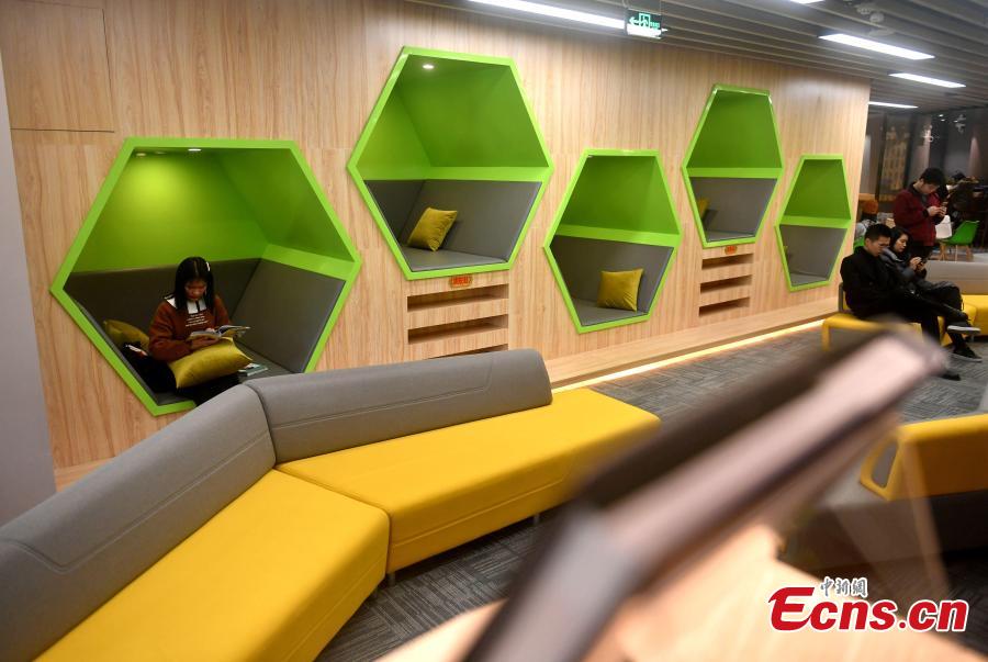 The 24-hour study room in Qishan campus of Fujian Normal University in Fuzhou City, East China's Fujian Province, Feb. 27, 2019. The room that never closes includes sleeping cabins and a space management system. (Photo: China News Service/Lyu Ming)