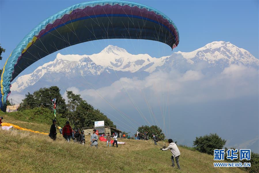 10月27日,在尼泊尔博克拉,工作人员拉起滑翔伞。近日,尼泊尔博克拉进入旅游旺季,秋高气爽时,每天有数百游客乘坐滑翔伞。[新华社 周盛平 摄]