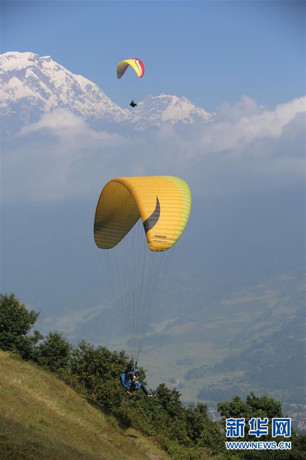 10月27日,在尼泊尔博克拉,游客乘滑翔伞飞行。近日,尼泊尔博克拉进入旅游旺季,秋高气爽时,每天有数百游客乘坐滑翔伞。[新华社 周盛平 摄]