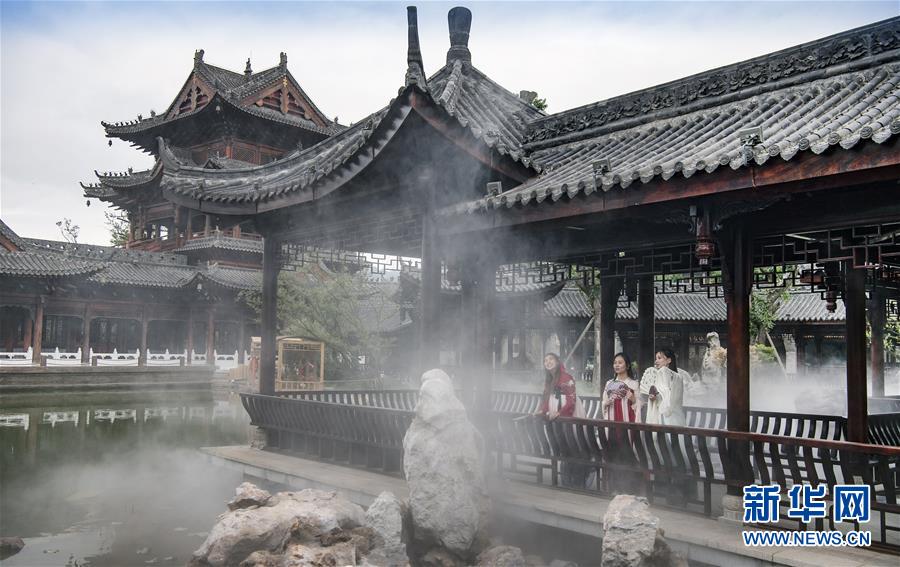 5月13日,几名身着汉服的游人在诸葛街游览。近日,陕西省汉中市勉县武侯镇的诸葛街对外开放运营。诸葛街景区由汉式园林建筑及楼台水榭、亭廊阶石、木质亲水栈道等20多处景观组成,集旅游休闲、特色民宿、地方美食等为一体,服务游客的同时为760多人提供了就业。[新华社记者 陶明 摄]