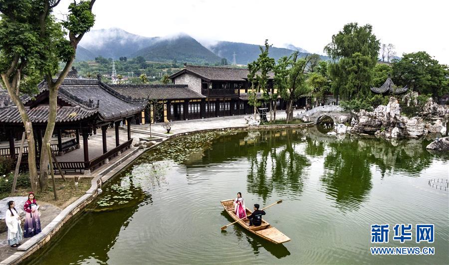 5月13日,身着汉服的游人在诸葛街淡泊湖休闲(无人机照片)。近日,陕西省汉中市勉县武侯镇的诸葛街对外开放运营。诸葛街景区由汉式园林建筑及楼台水榭、亭廊阶石、木质亲水栈道等20多处景观组成,集旅游休闲、特色民宿、地方美食等为一体,服务游客的同时为760多人提供了就业。[新华社记者 陶明 摄]