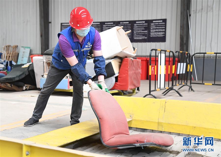 6月3日,在海淀区再生资源回收分拣加工中心,工作人员将分解后的废旧座椅放入自动化破碎设备。近日,记者来到北京市海淀区西北旺镇的海淀区再生资源回收分拣加工中心,了解废旧沙发、床垫等大件垃圾处理程序。据了解,大件垃圾到达分拣加工中心后,工作人员对其简单分解后,再通过大件垃圾自动化破碎设备进行处理,每小时可处理大件垃圾110余件。[新华社记者 任超 摄]