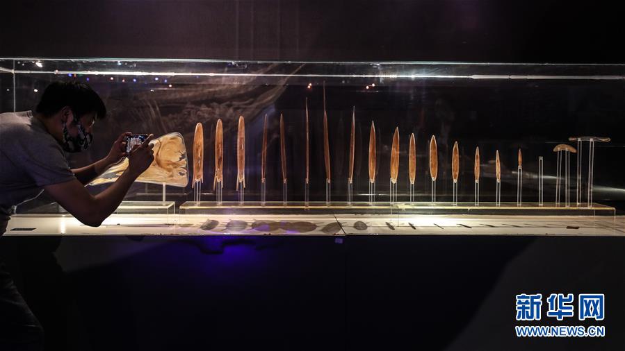 A visitor takes photos of exhibits at an exhibition about giant sperm whales in Dalian, northeast China's Liaoning Province, June 4, 2020. In recent days, a special exhibition titled "Legend of giant whale" was opened to public in Dalian. The main exhibit of the exhibition is a plastinated specimen of the dead sperm whale "Yangyang", which was stranded at a wharf in Rudong County of east China's Jiangsu Province in 2016 and then sent to Dalian to be processed into a specimen. (Xinhua/Pan Yulong)
