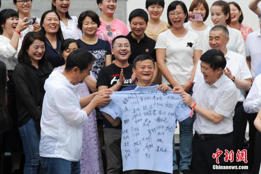 6月6日晚上6点06分,马云在合肥稻香楼宾馆“摆下”6桌火锅,邀请66名安徽支援湖北医疗队队员一起吃火锅。同时,他还同步邀请6000多名各地援鄂医护人员,通过在线直播的方式一起“云火锅”,这6000多名援鄂医护人员的火锅将由电商平台骑手配送到家。图为安徽援鄂医疗队为马云送上队服。 【中新网 张娅子 摄】