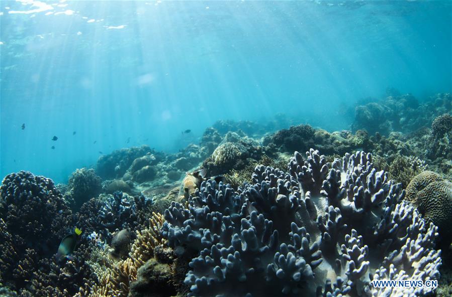 Photo taken on April 29, 2020 shows the corals at a marine ranch in the sea area of Wuzhizhou Island in Sanya, south China's Hainan Province. The marine ranch in the sea area of Wuzhizhou Island in Sanya is China's first tropical marine ranch. In recent years, the marine ranch has successively carried out artificial reef laying, marine environment restoration and coral transplantation, gradually promoting the protection and restoration of the marine ecosystem. By the end of 2019, a total of 1,526 artificial fishing reefs of various types, 21 ship reefs and a batch of volcanic rock reefs have been laid in the marine ranch off Wuzhizhou Island. (Xinhua/Yang Guanyu)