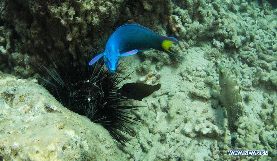 Fishes forage around the artificial reefs at a marine ranch in the sea area of Wuzhizhou Island in Sanya, south China's Hainan Province, March 28, 2020. The marine ranch in the sea area of Wuzhizhou Island in Sanya is China's first tropical marine ranch. In recent years, the marine ranch has successively carried out artificial reef laying, marine environment restoration and coral transplantation, gradually promoting the protection and restoration of the marine ecosystem. By the end of 2019, a total of 1,526 artificial fishing reefs of various types, 21 ship reefs and a batch of volcanic rock reefs have been laid in the marine ranch off Wuzhizhou Island. (Xinhua/Yang Guanyu)