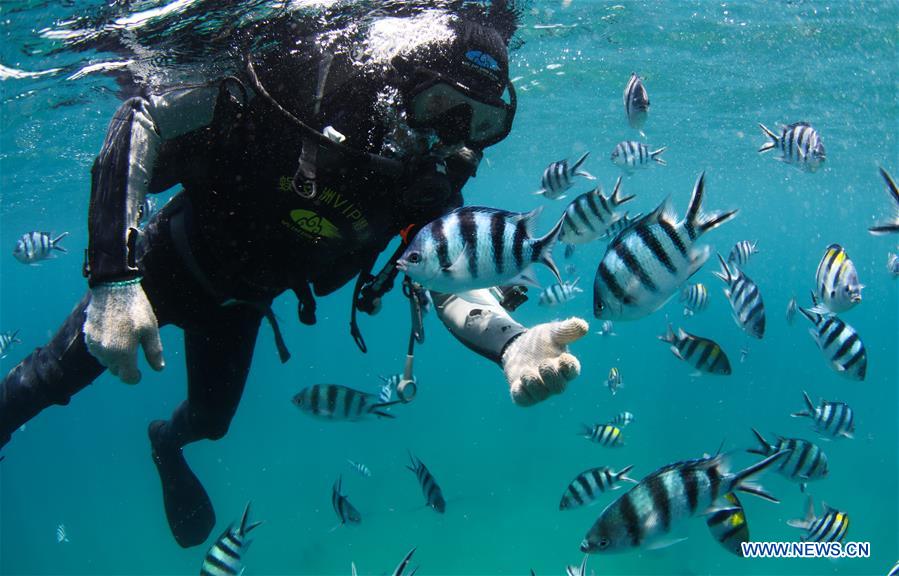 A staff member dives in the sea area of Wuzhizhou Island in Sanya, south China's Hainan Province, April 27, 2020. The marine ranch in the sea area of Wuzhizhou Island in Sanya is China's first tropical marine ranch. In recent years, the marine ranch has successively carried out artificial reef laying, marine environment restoration and coral transplantation, gradually promoting the protection and restoration of the marine ecosystem. By the end of 2019, a total of 1,526 artificial fishing reefs of various types, 21 ship reefs and a batch of volcanic rock reefs have been laid in the marine ranch off Wuzhizhou Island. (Xinhua/Yang Guanyu)