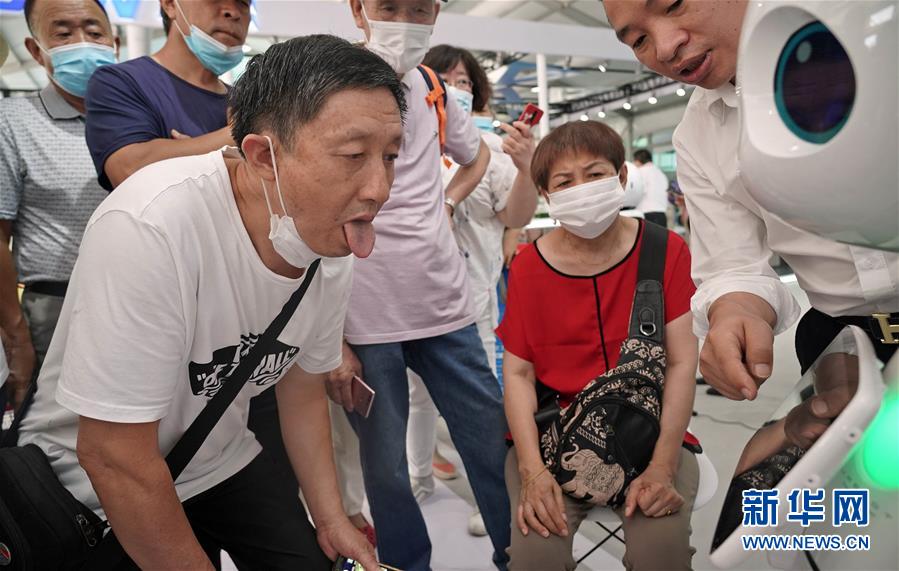9月7日,在服贸会服务机器人专题展区,一款中医AI机器人为观众看舌苔。这家企业的中医AI机器人可通过中医诊断方式与人交互,并提供体质检测、健康咨询等服务。[新华社记者 才扬 摄]