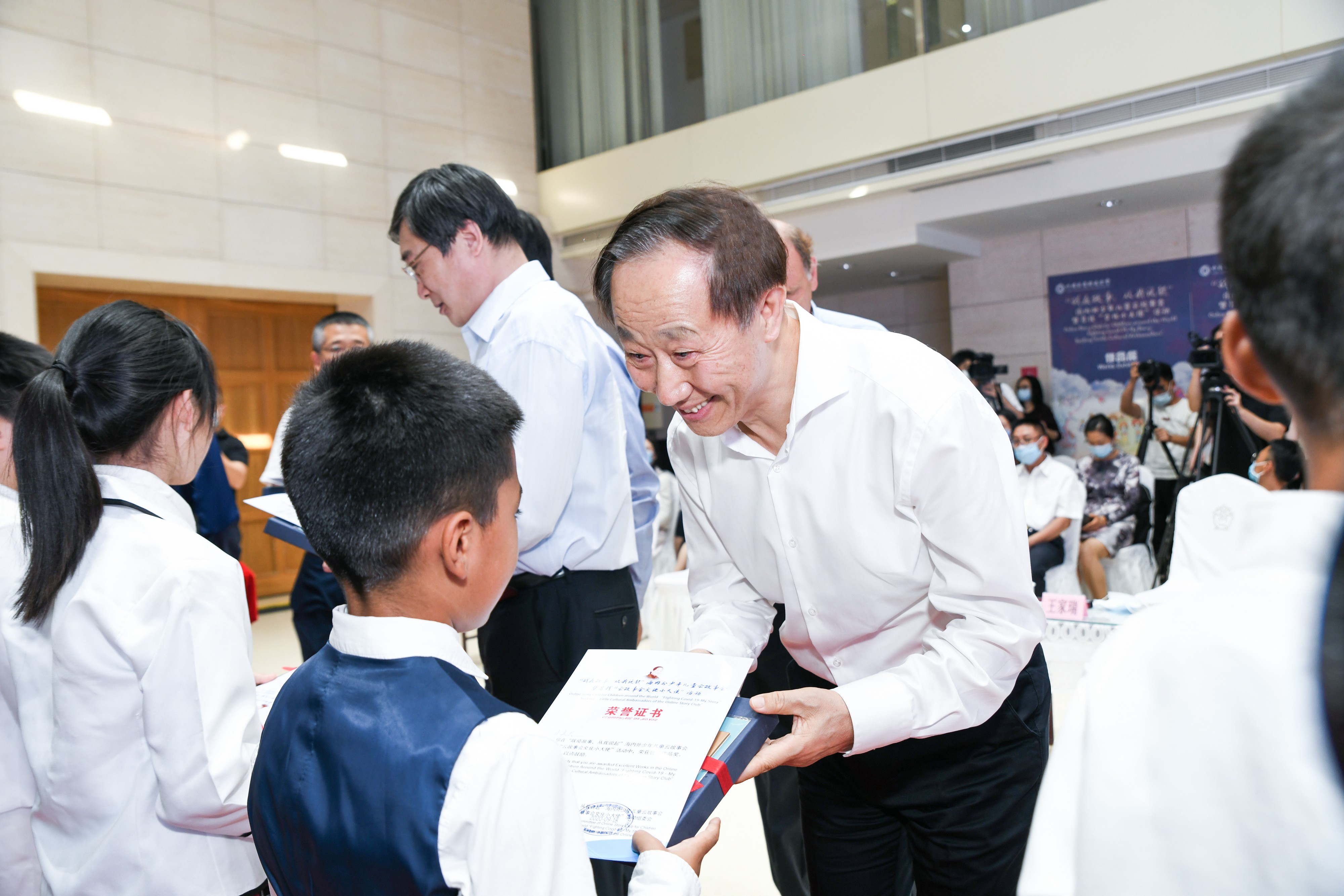与会领导为在京获奖少年儿童代表颁发荣誉证书和奖品,参观了海内外少年儿童抗疫作品展,和少年儿童代表共同放飞和平鸽。