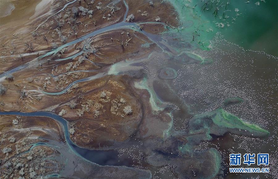 这是栖息于肯尼亚博戈里亚湖的火烈鸟(2017年6月20日无人机拍摄)。[新华社记者 陈诚 摄]