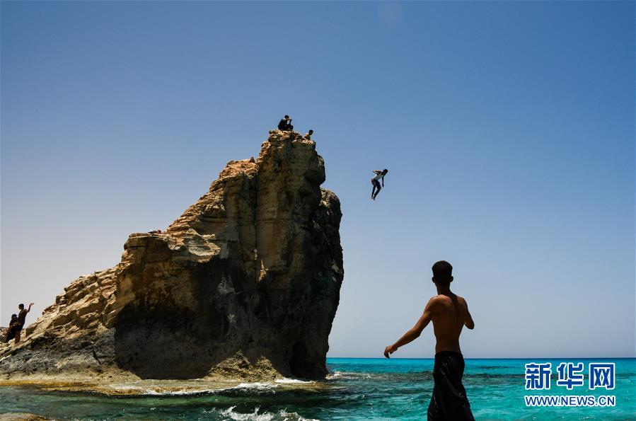2018年6月8日,在埃及西北部地中海沿岸城市马特鲁港,一名男子跃入水中。[新华社记者 邬惠我 摄]