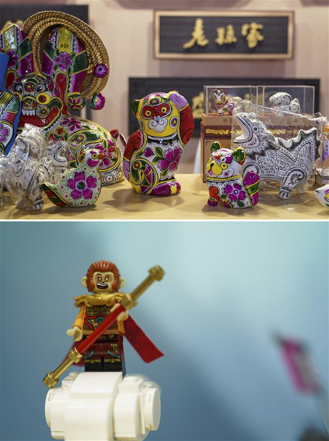 Combo photo taken on Nov. 9, 2020 shows a mud figure of monkey displayed at the booth of northwest China's Shaanxi Province (top); and the famous cartoon figure Monkey King built by Lego bricks displayed at the booth of Danish toy giant LEGO Group at the Consumer Goods exhibition area, during the third China International Import Expo (CIIE) in Shanghai, east China. CIIE not only provides business opportunities for enterprises, but also becomes a platform to display items of various cultural features. (Xinhua/Zhang Haofu)