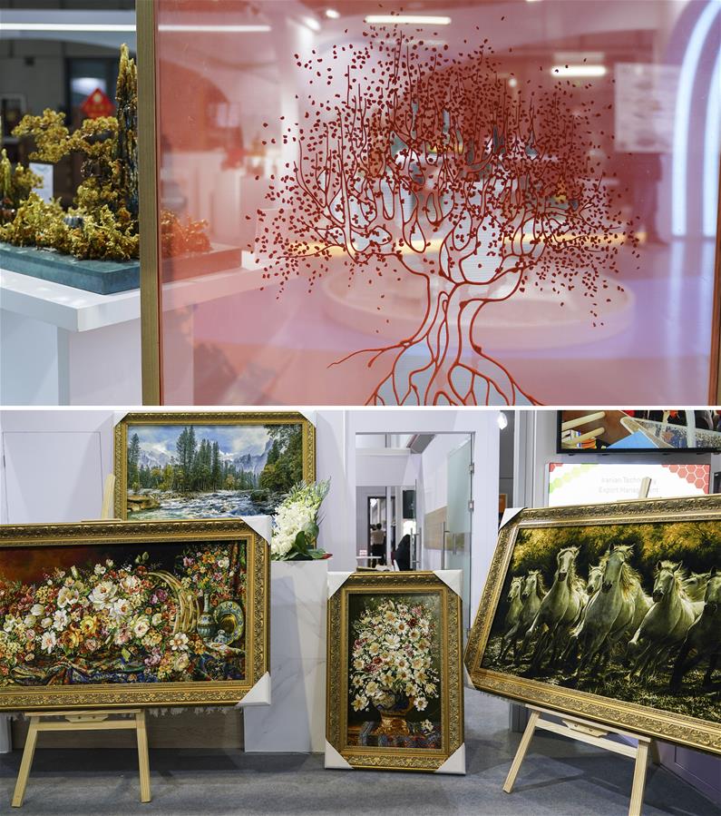 Combo photo shows a Chinese traditional embroidery artwork displayed at the booth of east China's Zhejiang Province on Nov. 9, 2020 (top); and Persian handmade tapestries displayed at the Consumer Goods exhibition area on Nov. 8, 2020, during the third China International Import Expo (CIIE) in Shanghai, east China. CIIE not only provides business opportunities for enterprises, but also becomes a platform to display items of various cultural features. (Xinhua/Zhang Haofu)